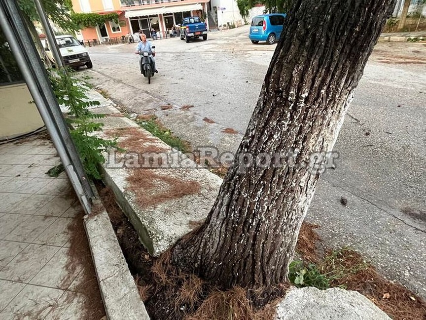 Μεγάλο δέντρο τώρα πήρε επικίνδυνη κλίση, σηκώνοντας τα τσιμέντα, ενώ έχουν ξεκινήσει ενέργειες από το Δήμο για να κοπεί και να απομακρυνθεί.