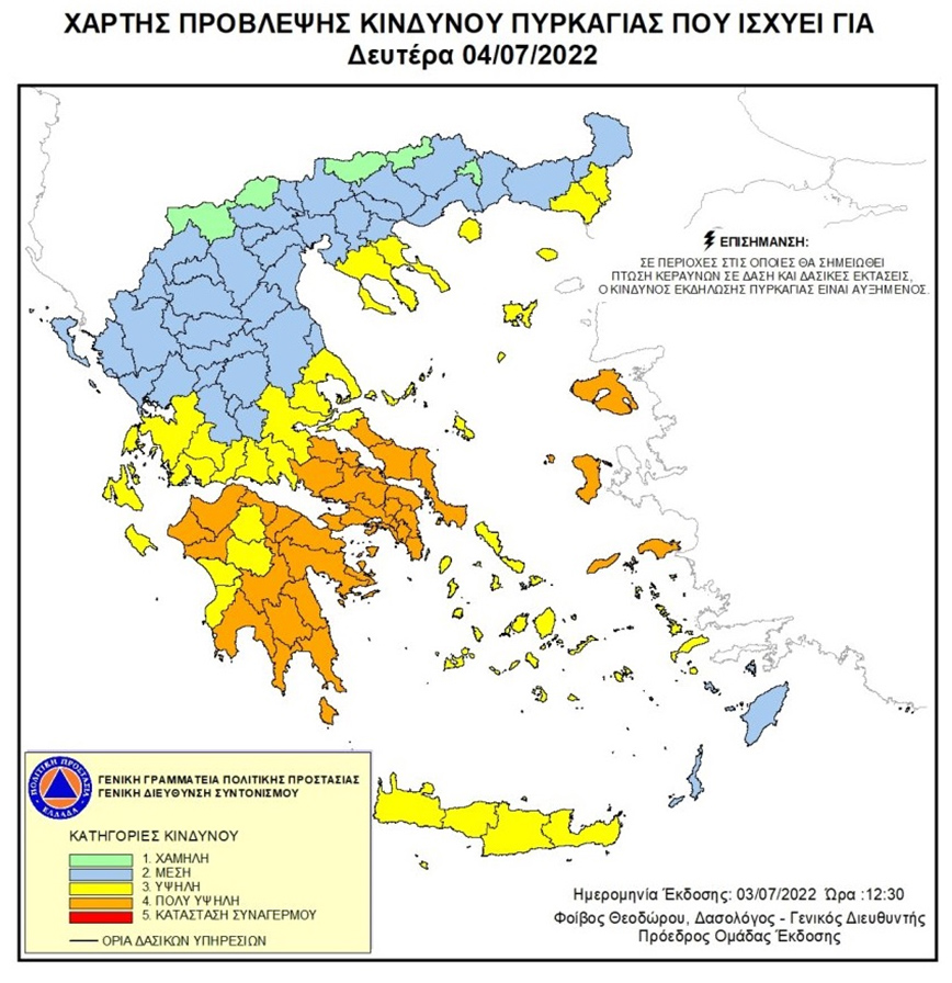 Υπενθυμίζεται ότι σύμφωνα με το Χάρτη Πρόβλεψης Κινδύνου Πυρκαγιάς, που εκδίδει η Γενική Γραμματεία Πολιτικής Προστασίας για σήμερα Δευτέρα 4 Ιουλίου 2022, προβλέπεται πολύ υψηλός κίνδυνος πυρκαγιάς, με κατηγορία κινδύνου 4 σε:
