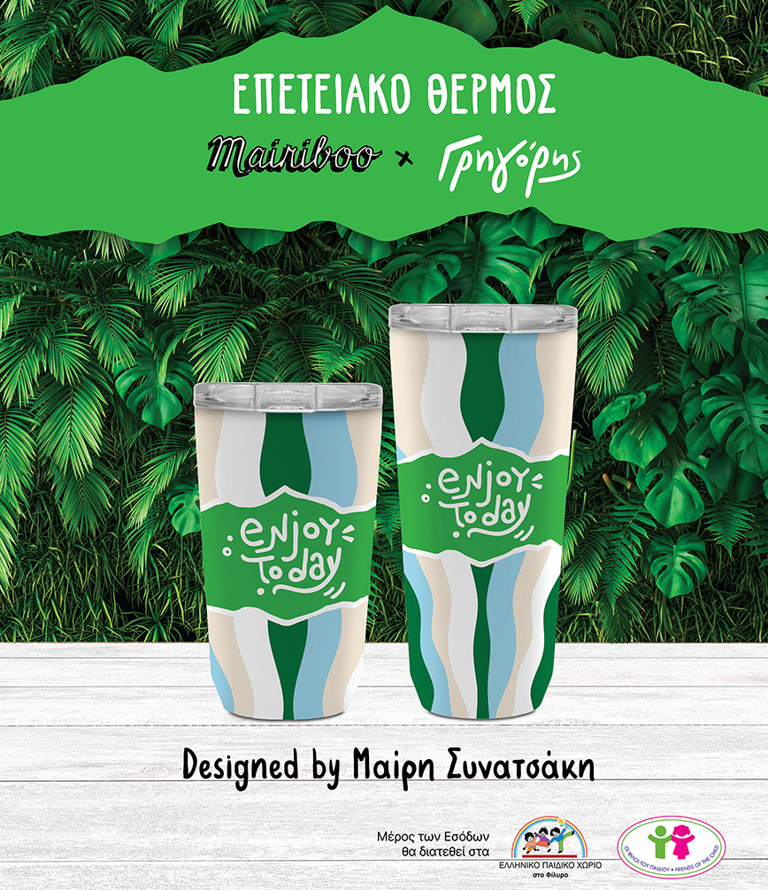Το θερμός σχεδίασε η Μαίρη Συνατσάκη και έχει την υπογραφή Mairiboo x Γρηγόρης. Mε αισιόδοξη και χαρούμενη διάθεση, η Μαίρη δημιούργησε ένα αποτέλεσμα εξαιρετικής αισθητικής, που με το μήνυμα enjoy today… μας φτιάχνει τη μέρα! Κατασκευασμένο από ανοξείδωτο ατσάλι, είναι κατάλληλο για ζεστά και κρύα ροφήματα, τα οποία διατηρεί για πολλές ώρες στην ιδανική θερμοκρασία. Ταυτόχρονα είναι eco-friendly, καθώς ενθαρρύνει τους καταναλωτές να αντικαταστήσουν πλαστικά είδη μίας χρήσης, μειώνοντας με αυτό τον τρόπο το περιβαλλοντικό αποτύπωμα.