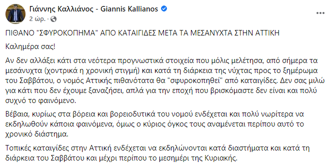 Καλό θα είναι κατά την ταπεινή μου γνώμη να είμαστε όλοι ιδιαίτερα προσεκτικοί, μεριμνώντας για τη λήψη μέτρων αυτοπροστασίας!!», καταλήγει ο παρουσιαστής του καιρού της ΕΡΤ.