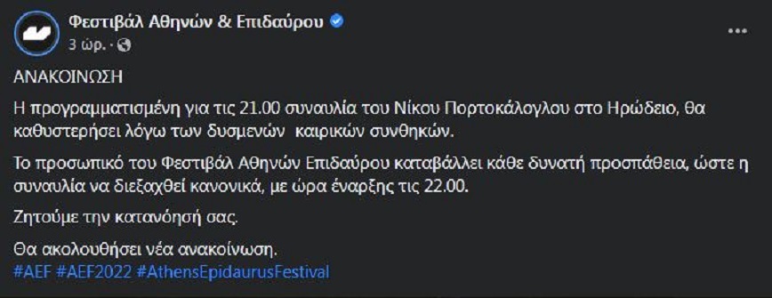 «Η προγραμματισμένη για τις 21.00 συναυλία του Νίκου Πορτοκάλογλου στο Ηρώδειο, θα καθυστερήσει λόγω των δυσμενών καιρικών συνθηκών.