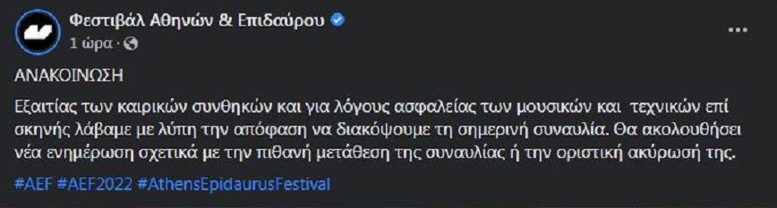 «Εξαιτίας των καιρικών συνθηκών και για λόγους ασφαλείας των μουσικών και τεχνικών επί σκηνής λάβαμε με λύπη την απόφαση να διακόψουμε τη σημερινή συναυλία. Θα ακολουθήσει νέα ενημέρωση σχετικά με την πιθανή μετάθεση της συναυλίας ή την οριστική ακύρωσή της».