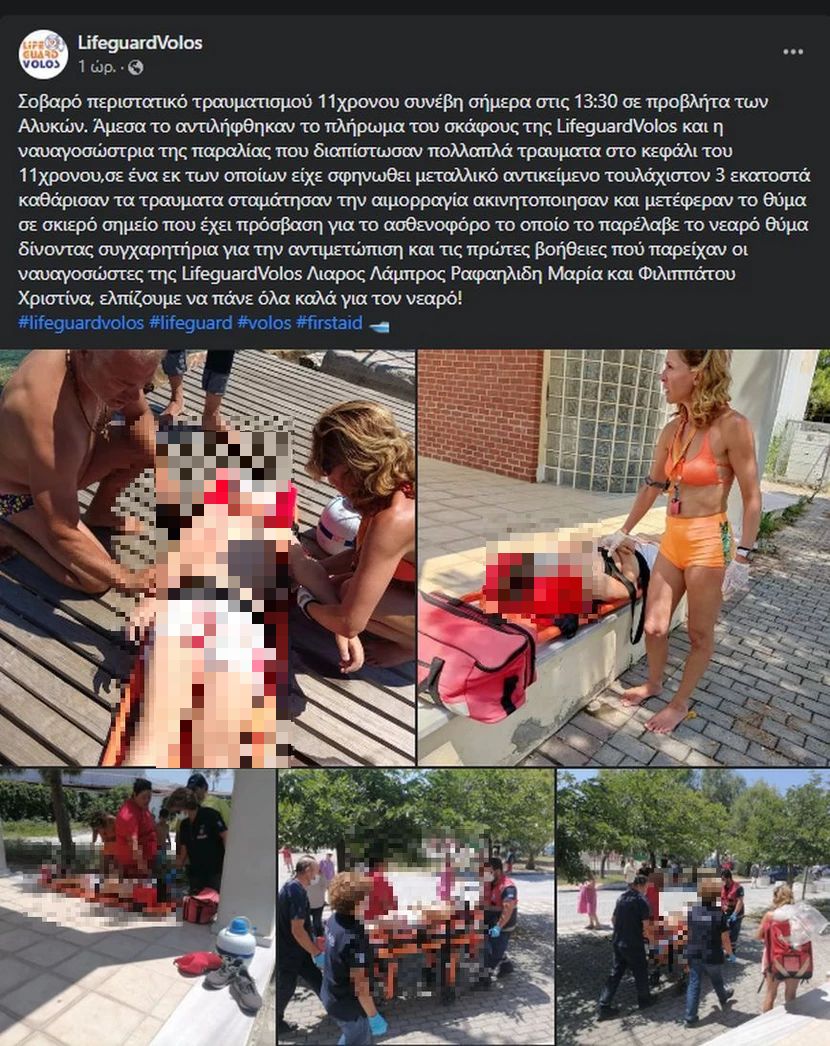 Τα μέλη του ναυαγοσωστικού σκάφους της LifeguardVolos έσπευσαν να βοηθήσουν το τραυματισμένο παιδί άμεσα και να περιποιηθούν τα τραύματα του. Στο ένα τραύμα του 11χρονου, όπως αναγράφεται και στη σχετική ανάρτηση στη σελίδα Lifeguard Volos, είχε σφηνωθει μεταλλικό αντικείμενο τουλάχιστον 3 εκατοστά.