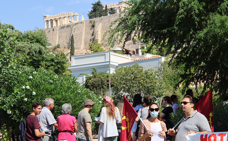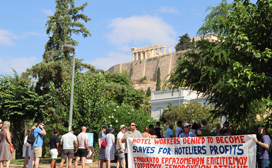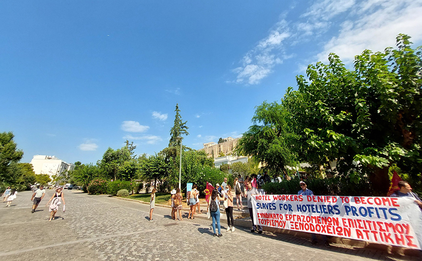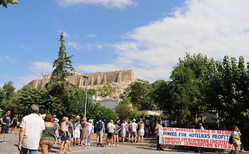 Παρέμβαση στην Ακρόπολη με πανό πραγματοποίησε τη Δευτέρα (11/7) το Συνδικάτο Επισιτισμού Τουρισμού Ξενοδοχοϋπαλλήλων Ν. Αττικής ενόψει της απεργίας του κλάδου, την Τετάρτη 13 Ιούλη.