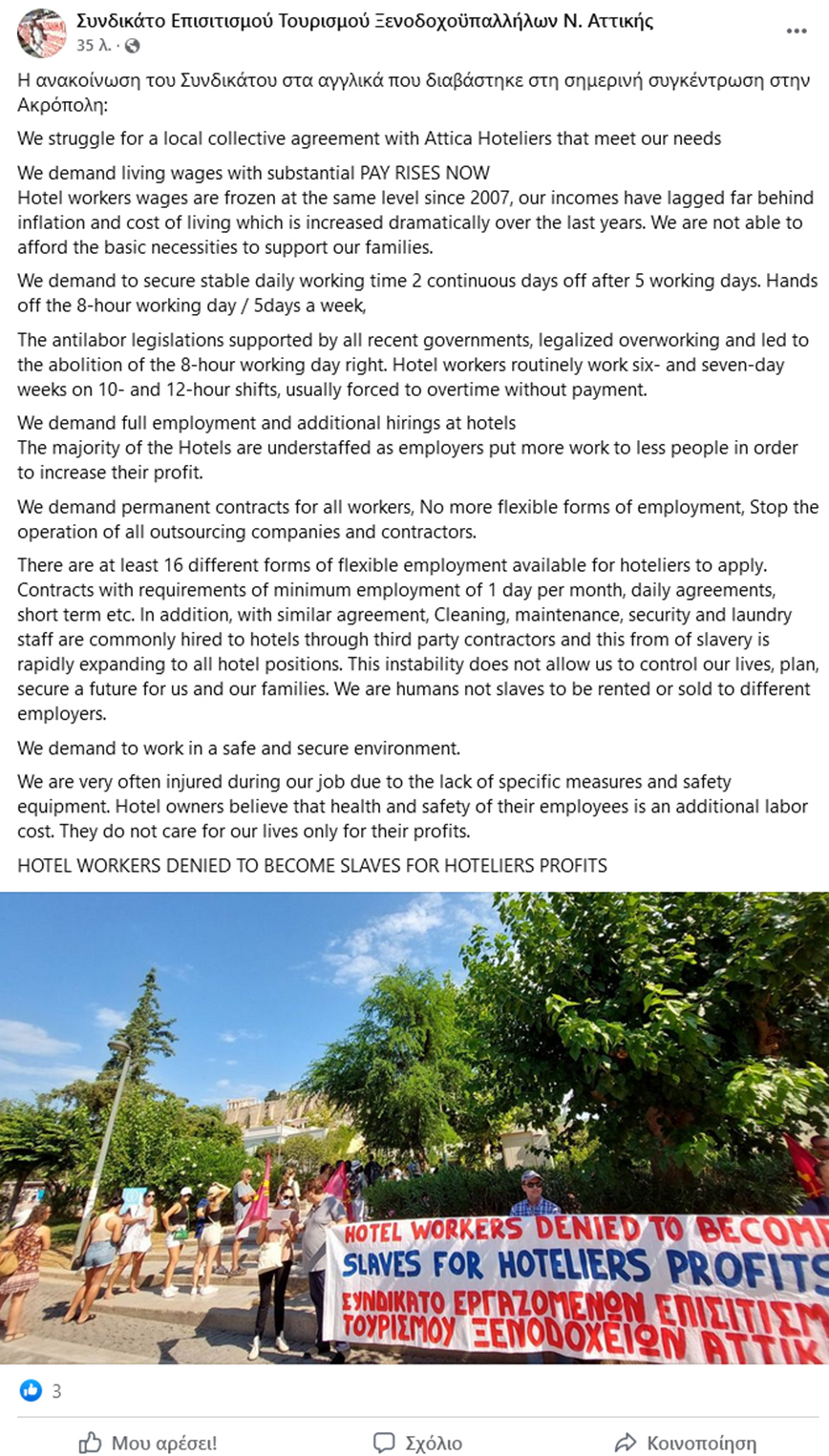 Παράλληλα το Συνδικάτο μέσω της κινητοποίησής του επισημαίνει πως εκφράζει την αλληλεγγύη του στους εργαζόμενους της Ευρώπης στον κλάδο του τουρισμού που βρίσκονται σε απεργιακές κινητοποιήσεις.