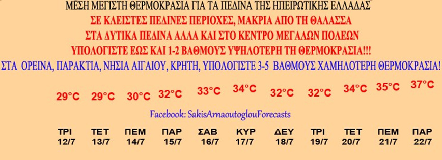 «Η θερμοκρασία στην Ελλάδα το επόμενο 10ήμερο με μια μόνο ματιά. Διαβάστε προσεκτικά τις λεπτομέρειες στο πάνω μέρος της εικόνας για να υπολογίσετε τη θερμοκρασία στην περιοχή σας» έγραψε στο Facebook.
