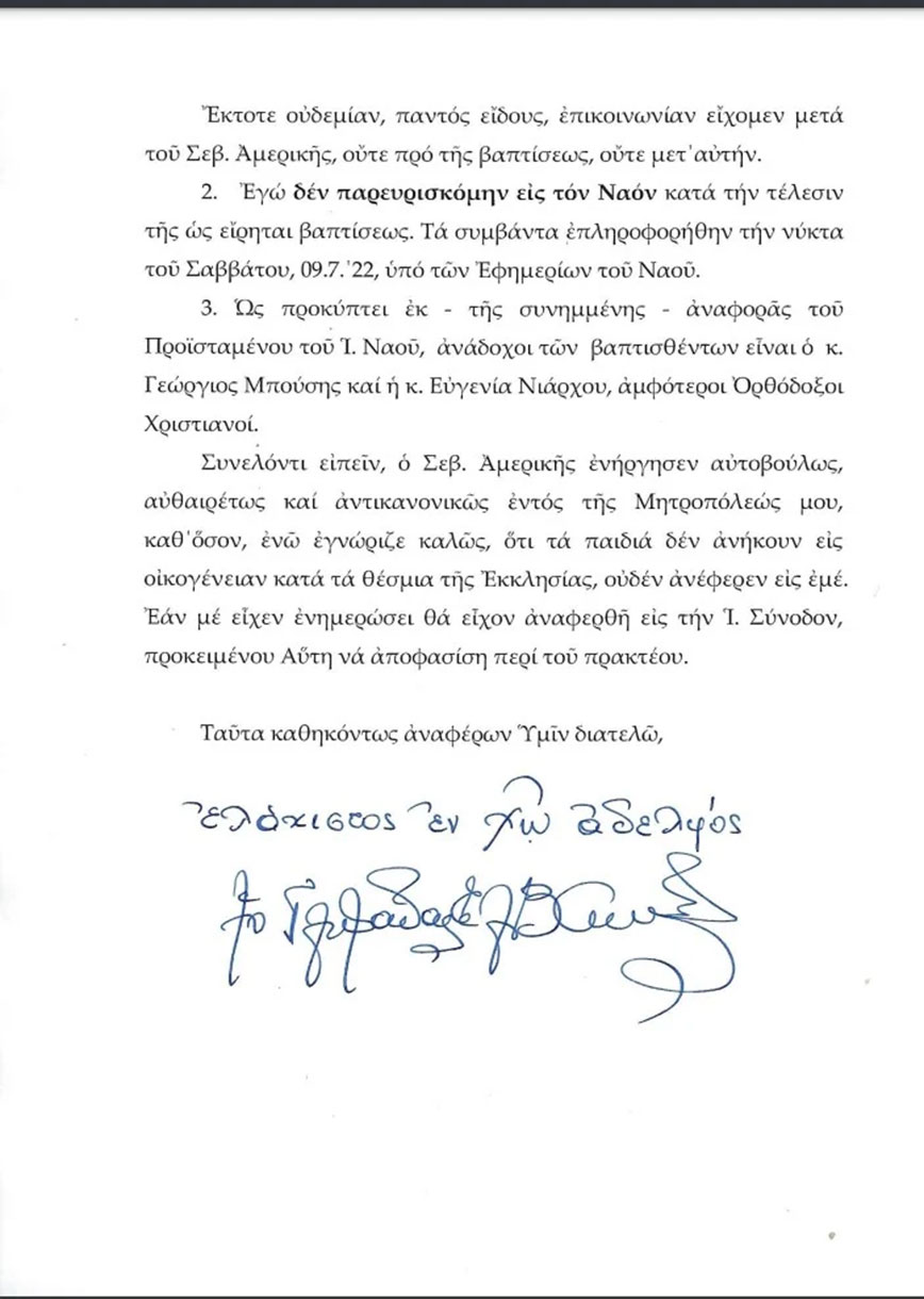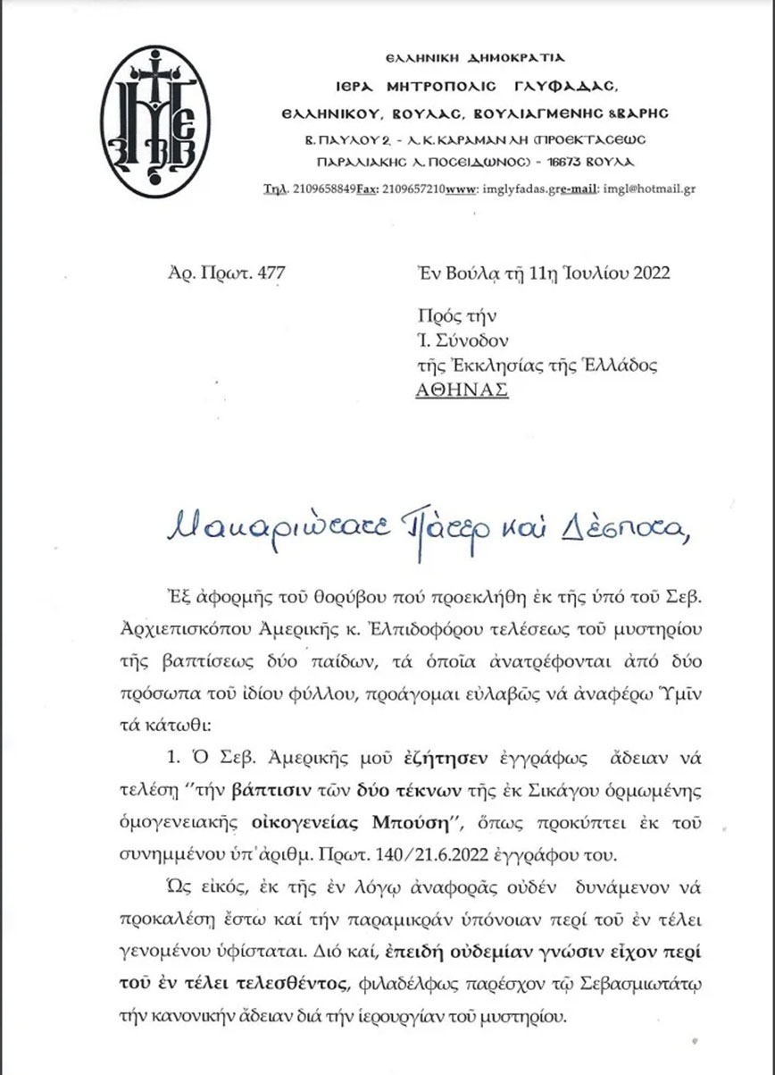 Ο Μητροπολίτης Γλυφάδας, επισημαίνει ότι στέλνει την επιστολή «εξ αφορμής του θορύβου που προεκλήθη» και λέει ότι αυτός δεν είχε ενημερωθεί για το τι είχε σκοπό να κάνει ο Αρχιεπίσκοπος Ελπιδοφόρος καθώς: «ο Σεβασμιότατος Αμερικής μου εζήτησεν εγγράφως άδειαν να τελέση την βάπτισην των δύο τέκνων της εκ Σικάγου ορμώμενης ομογενειακής οικογένειας Μπούση».