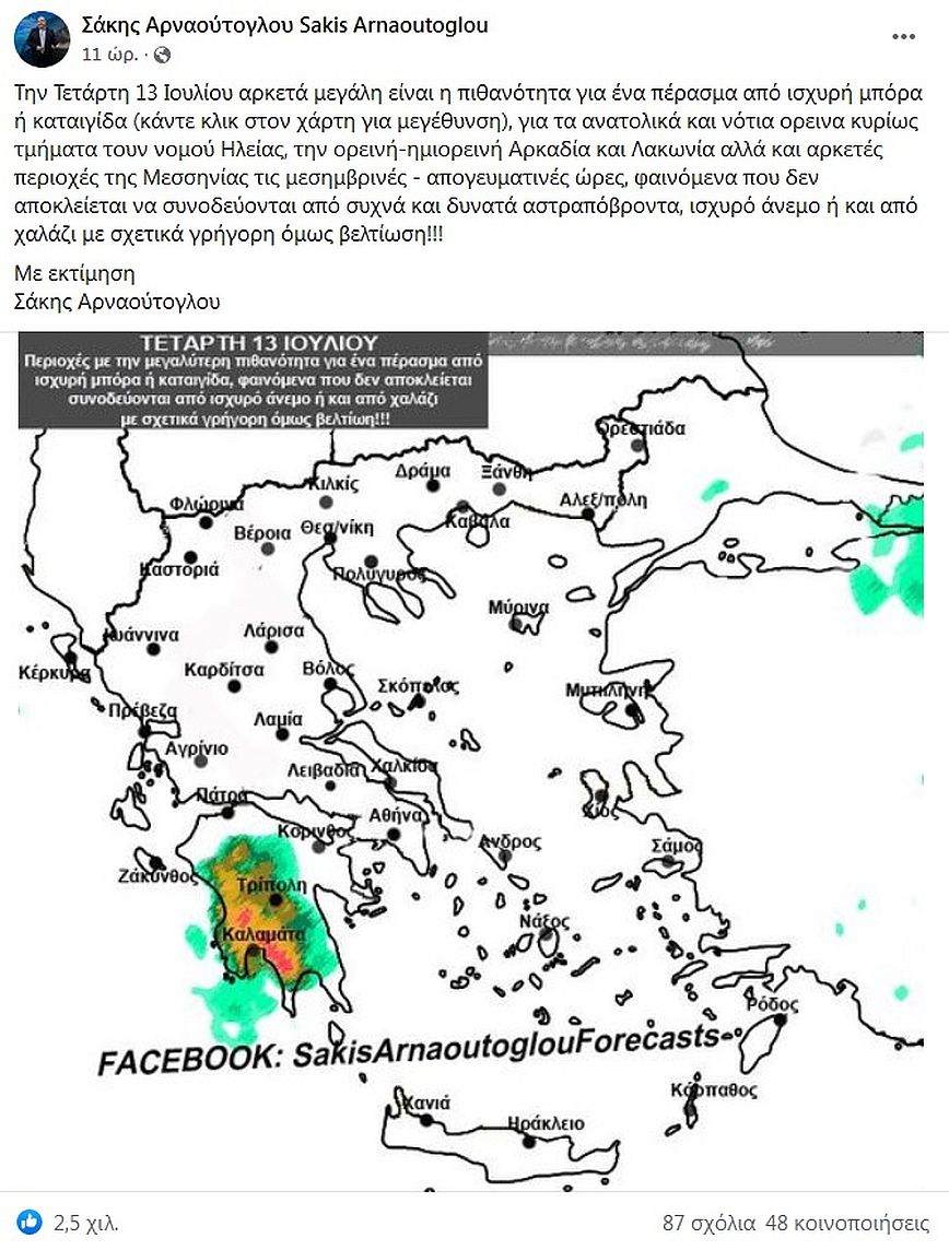 «Την Τετάρτη 13 Ιουλίου αρκετά μεγάλη είναι η πιθανότητα για ένα πέρασμα από ισχυρή μπόρα ή καταιγίδα (κάντε κλικ στον χάρτη για μεγέθυνση), για τα ανατολικά και νότια ορεινά κυρίως τμήματα τουν νομού Ηλείας, την ορεινή-ημιορεινή Αρκαδία και Λακωνία αλλά και αρκετές περιοχές της Μεσσηνίας τις μεσημβρινές – απογευματινές ώρες, φαινόμενα που δεν αποκλείεται να συνοδεύονται από συχνά και δυνατά αστραπόβροντα, ισχυρό άνεμο ή και από χαλάζι με σχετικά γρήγορη όμως βελτίωση!!!» ανέφερε στο Facebook.