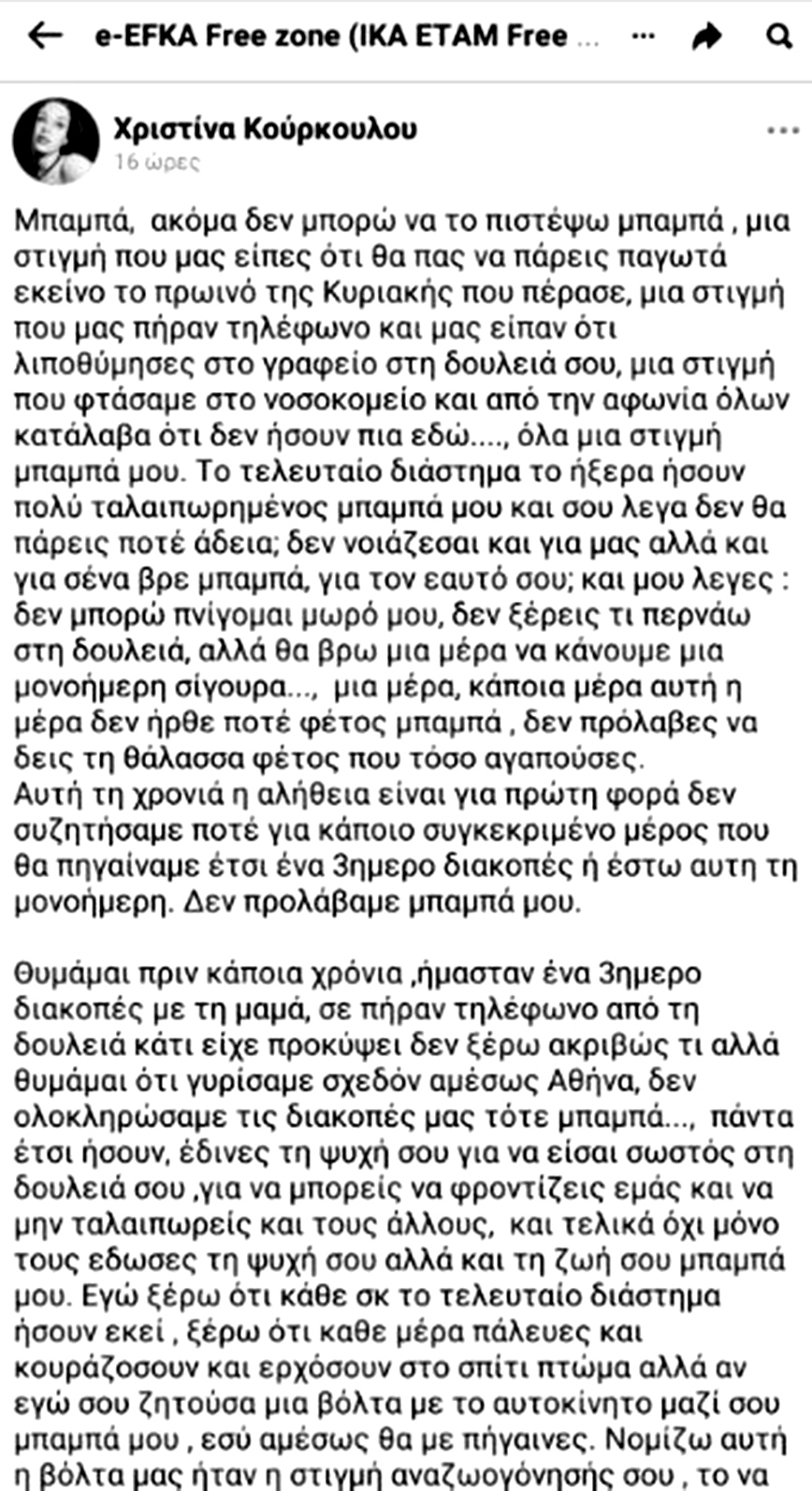 Συγκινεί η ανάρτηση που έκανε στο Facebook η 19χρονη κόρη του Κώστα Κούρκουλου, Διευθυντή της Τοπικής Διεύθυνσης ΕΦΚΑ Πατησίων που πέθανε εν ώρα καθήκοντος.