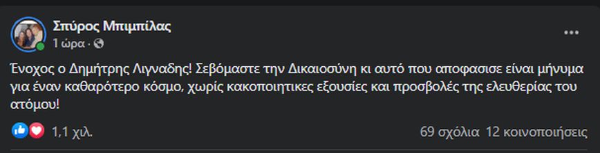 Συγκεκριμένα ο Σπύρος Μπιμπίλας έγραψε: «Ένοχος ο Δημήτρης Λιγνάδης! Σεβόμαστε την Δικαιοσύνη κι αυτό που αποφάσισε είναι μήνυμα για έναν καθαρότερο κόσμο, χωρίς κακοποιητικές εξουσίες και προσβολές της ελευθερίας του ατόμου!» έγραψε ο Σπύρος Μπιμπίλας.