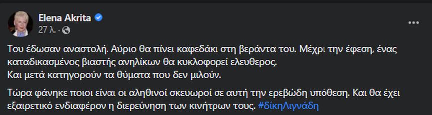 Συγκεκριμένα, η Έλενα Ακρίτα έγραψε: «Του έδωσαν αναστολή. Αύριο θα πίνει καφεδάκι στη βεράντα του. Μέχρι την έφεση, ένας καταδικασμένος βιαστής ανηλίκων θα κυκλοφορεί ελευθερος. Και μετά κατηγορούν τα θύματα που δεν μιλούν. Τώρα φάνηκε ποιοι είναι οι αληθινοί σκευωροί σε αυτή την ερεβώδη υπόθεση. Και θα έχει εξαιρετικό ενδιαφέρον η διερεύνηση των κινήτρων τους».