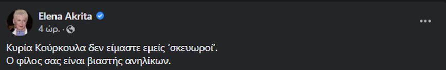 Σε άλλη της ανάρτηση, η Έλενα Ακρίτα απευθύνθηκε στην Ελένη Κούρκουλα και την κατάθεση της στη δίκη του Δημήτρη Λιγνάδη. Η δημοσιογράφος έγραψε χαρακτηριστικά πως: «Κυρία Κούρκουλα δεν είμαστε εμείς ‘σκευωροί’. Ο φίλος σας είναι βιαστής ανηλίκων».