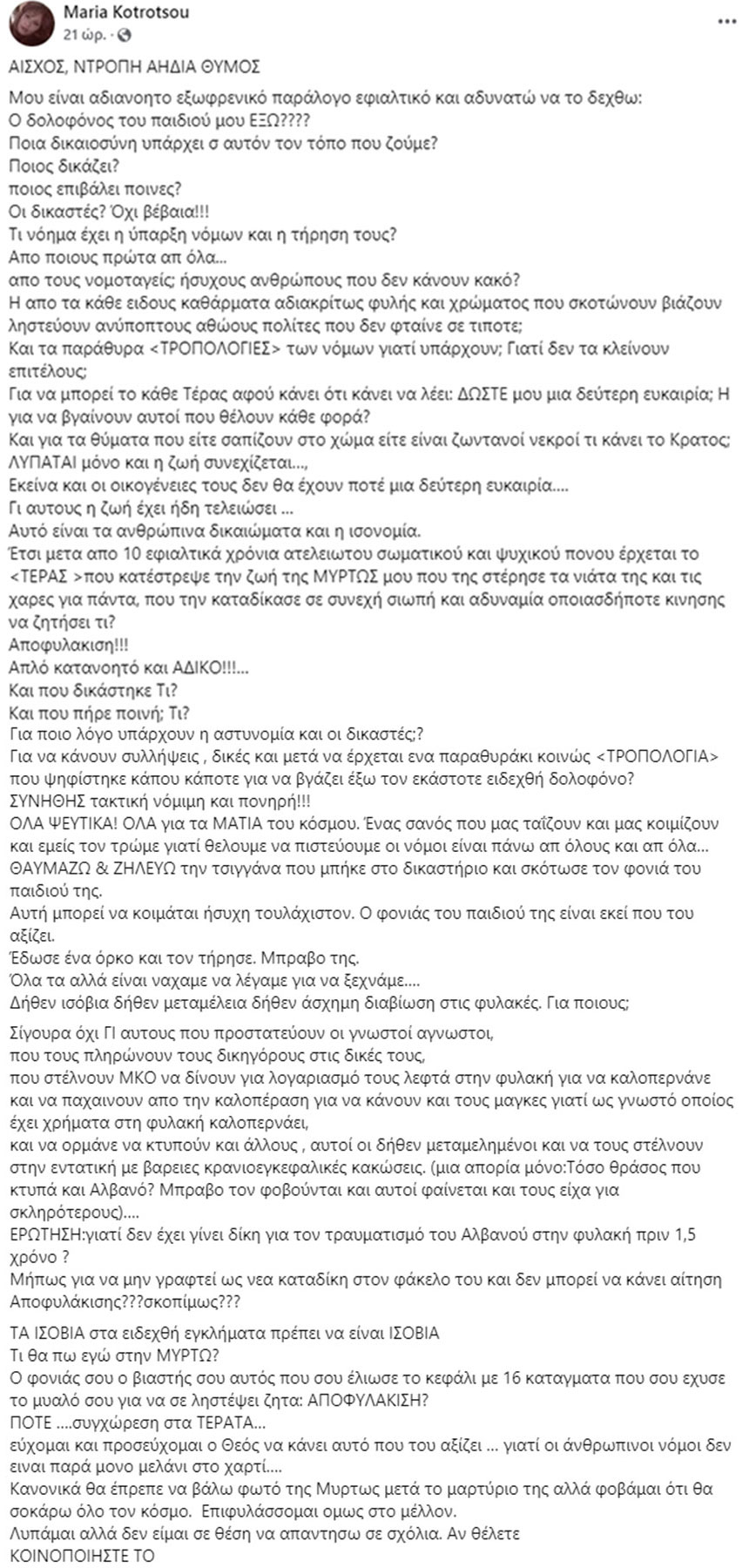 Συγκεκριμένα, η μητέρα της Μυρτούς έγραψε: «ΑΙΣΧΟΣ, ΝΤΡΟΠΗ ΑΗΔΙΑ ΘΥΜΟΣ Μου είναι αδιανοητο εξωφρενικό παράλογο εφιαλτικό και αδυνατώ να το δεχθω: Ο δολοφόνος του παιδιού μου ΕΞΩ???? Ποια δικαιοσύνη υπάρχει σ αυτόν τον τόπο που ζούμε? Ποιος δικάζει? ποιος επιβάλει ποινες? Οι δικαστές? Όχι βέβαια!!! Τι νόημα έχει η ύπαρξη νόμων και η τήρηση τους?
