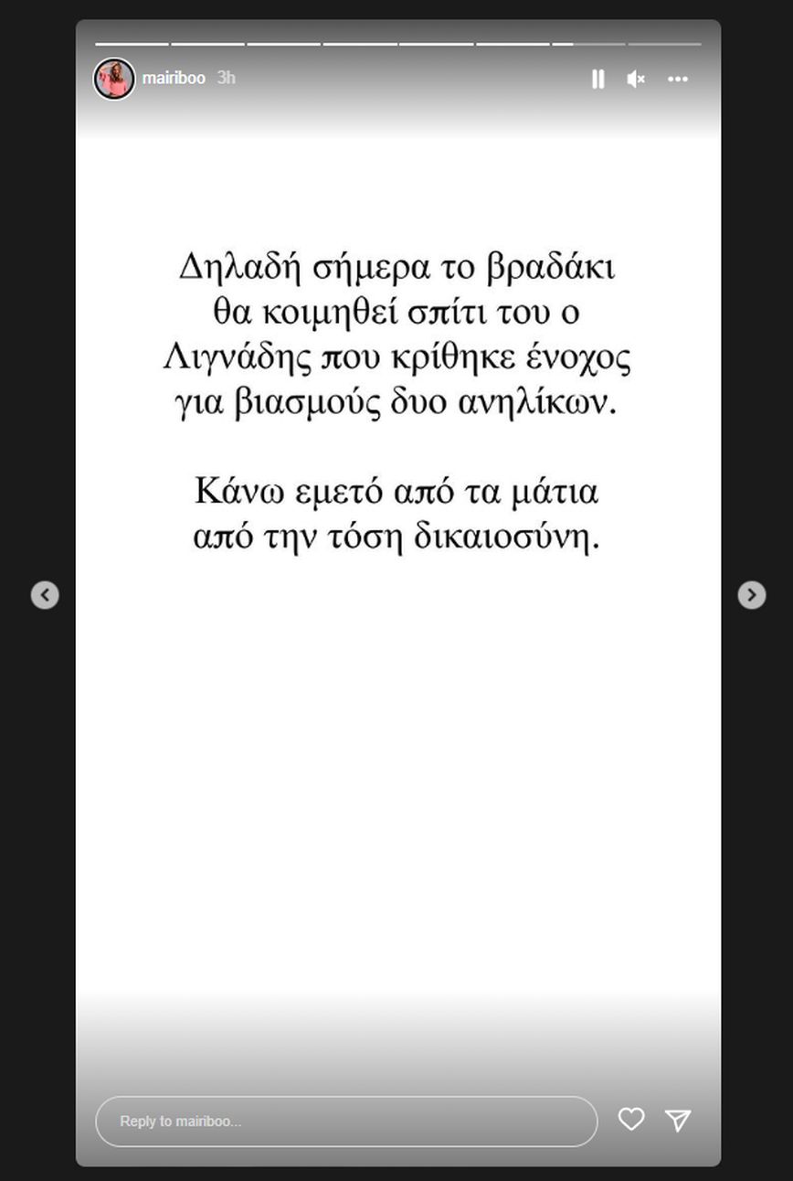 Η Μαίρη Συνατσάκη στο άκουσμα της απόφασης του δικαστηρίου για τον Δημήτρη Λιγνάδη ξέσπασε μέσω instagram. «Δηλαδή σήμερα το βραδάκι θα κοιμηθεί σπίτι του ο Λιγνάδης που κρίθηκε ένοχος για βιασμούς δυο ανηλίκων. Κάνω εμετό από τα μάτια από την τόση δικαιοσύνη», έγραψε η Μαίρη Συνατσάκη.