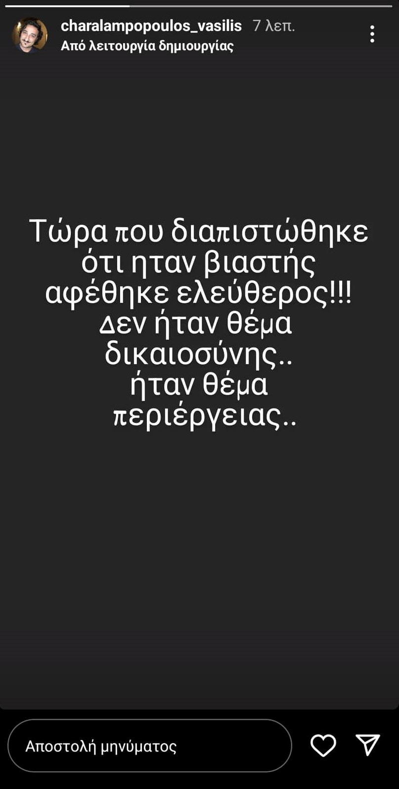 «Τώρα που διαπιστώθηκε ότι ήταν βιαστής αφέθηκε ελεύθερος!! Δεν ήταν θέμα δικαιοσύνης… ήταν θέμα περιέργειας», σχολίασε όλο νόημα ο ηθοποιός σε story που ανάρτησε στο Instagram.