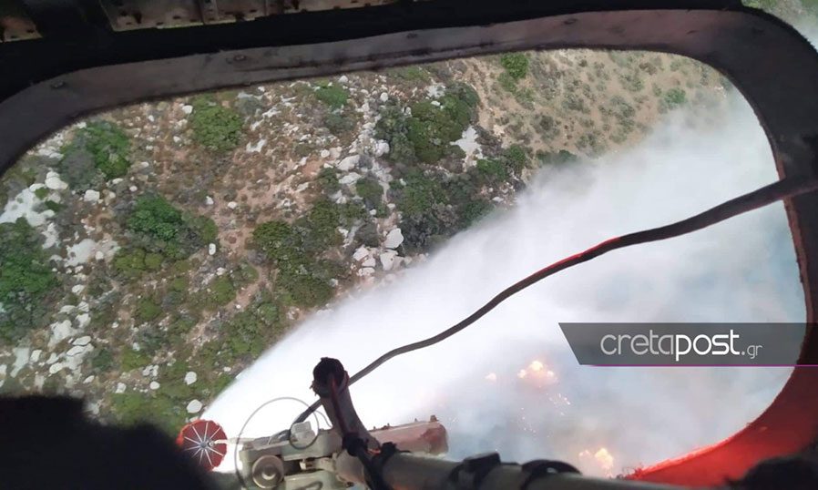 Στις φωτογραφίες του cretapost, διακρίνεται ξεκάθαρα η στιγμή που οι πυροσβέστες μέσα από τα ελικόπτερα επιχειρούν από αέρος για την κατάσβεση των μεγάλων πυρκαγιών που έχουν ξεσπάσει από νωρίς το πρωί σε Ροδάκινο και Ορνέ.