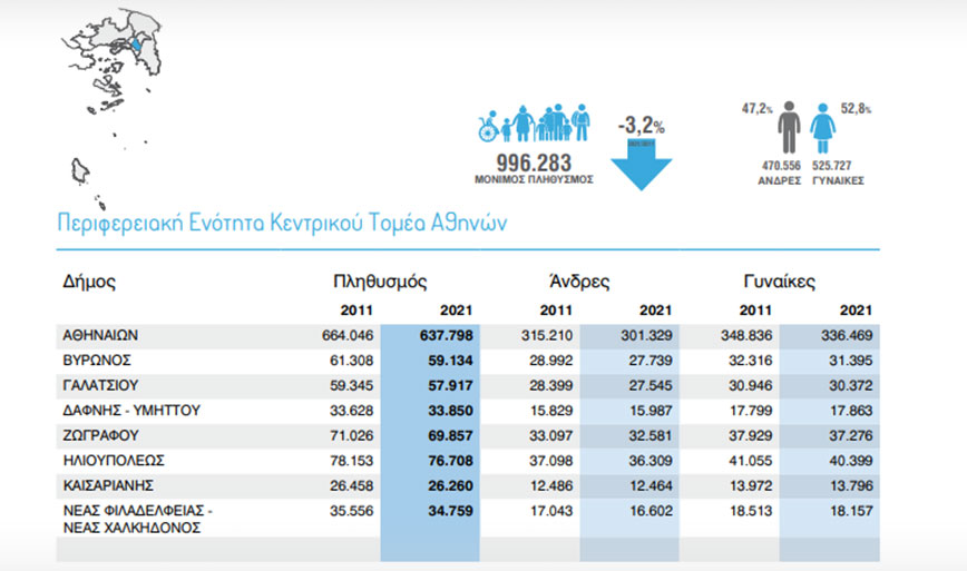Στο σύνολό του ο μόνιμος πληθυσμός της Περιφερειακής Ενότητας του Κεντρικού Τομέα Αθηνών κατέγραψε μείωση 3,2% και έφτασε σύμφωνα με τα προσωρινά αποτελέσματα της ΕΛΣΤΑΤ τα 996.283 άτομα.
