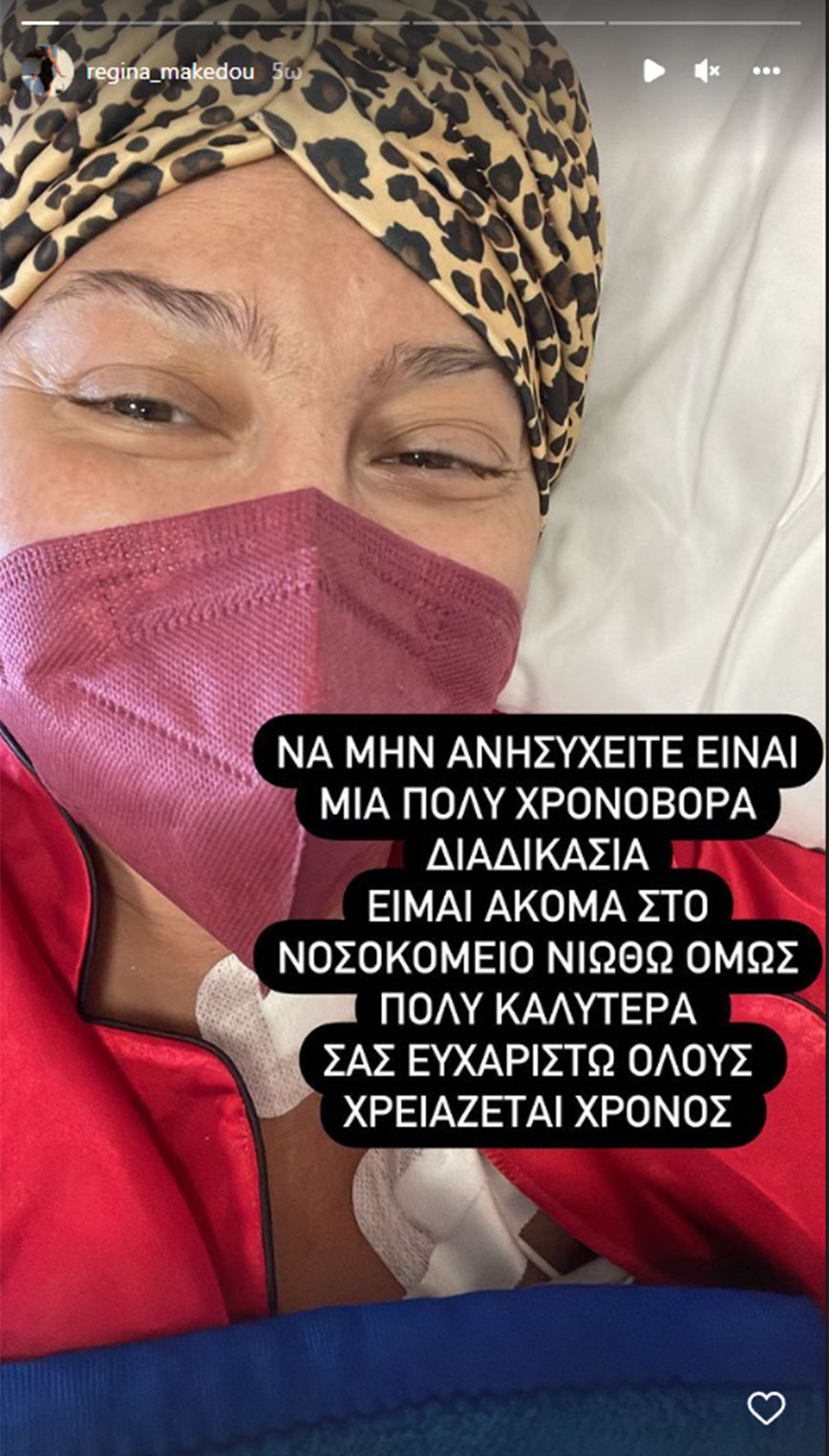 «Μην ανησυχείτε, είναι μια πολύ χρονοβόρα διαδικασία. Είμαι ακόμα στο νοσοκομείο, νιώθω όμως πολύ καλύτερα. Σας ευχαριστώ όλους, χρειάζεται χρόνος» έγραψε η Ρεγγίνα Μακέδου σε ένα από τα instastories της.