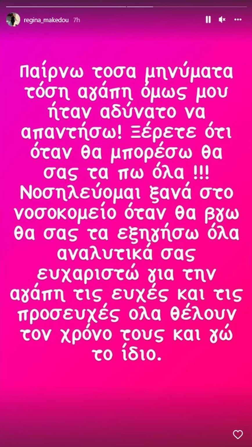 «Νοσηλεύομαι ξανά στο νοσοκομείο, όταν θα βγω θα σας τα εξηγήσω όλα αναλυτικά, σας ευχαριστώ για την αγάπη, τις ευχές και τις προσευχές όλα θέλουν τον χρόνο τους και εγώ το ίδιο» κατέληξε η Ρεγγίνα Μακέδου στο μήνυμα που έγραψε.