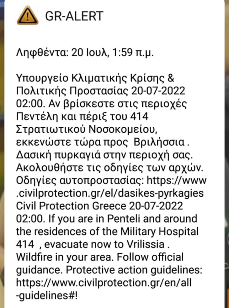 Πιο συγκεκριμένα το μήνυμα ανέφερε: «Αν βρίσκεστε στις περιοχές Πεντέλη και πέριξ του 414 Στρατιωτικού Νοσοκομείου, εκκενώστε προς Βριλήσσια».