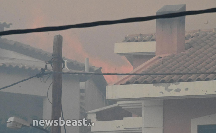 Οι κάτοικοι με τα λάστιχα στο χέρι προσπαθούν να σώσουν τα σπίτια τους, ενώ την ίδια στιγμή ηχούν οι σειρήνες της Πολιτικής Προστασίας που καλούν για εκκένωση της περιοχής.