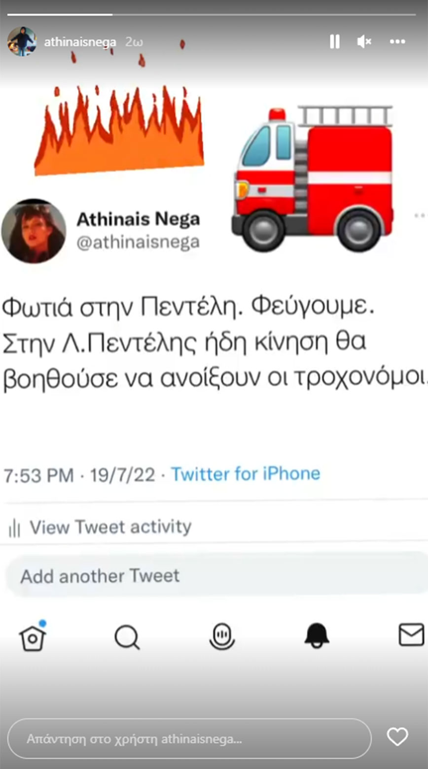 «Φωτιά στην Πεντέλη. Φεύγουμε. Στην Λ.Πεντέλης ήδη κίνηση θα βοηθούσε να ανοίξουν οι τροχονόμοι» έγραψε η Αθηναΐς Νέγκα στο μήνυμα της.