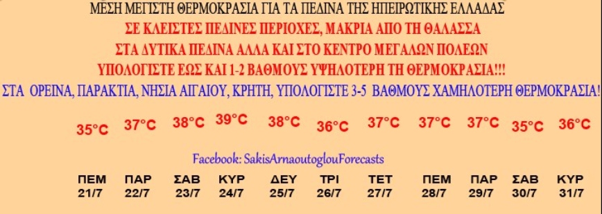 Σύμφωνα με τον παρουσιαστή του καιρού στην ΕΡΤ το Σάββατο (23/7), την Κυριακή (24/7) και τη Δευτέρα (25/7) θα δούμε τις υψηλότερος θερμοκρασίες οι οποίες θα αγγίξουν τους 38 με 39 βαθμούς. Ωστόσο, όπως αναφέρει ο Σάκης Αρναούτογλου στις κλειστές πεδινές περιοχές, μακριά από τη θάλασσα στα δυτικά πεδινά, αλλά και στο κέντρο των μεγάλων πόλεων ο υδράργυρος θα είναι 1 με 2 βαθμούς παραπάνω.