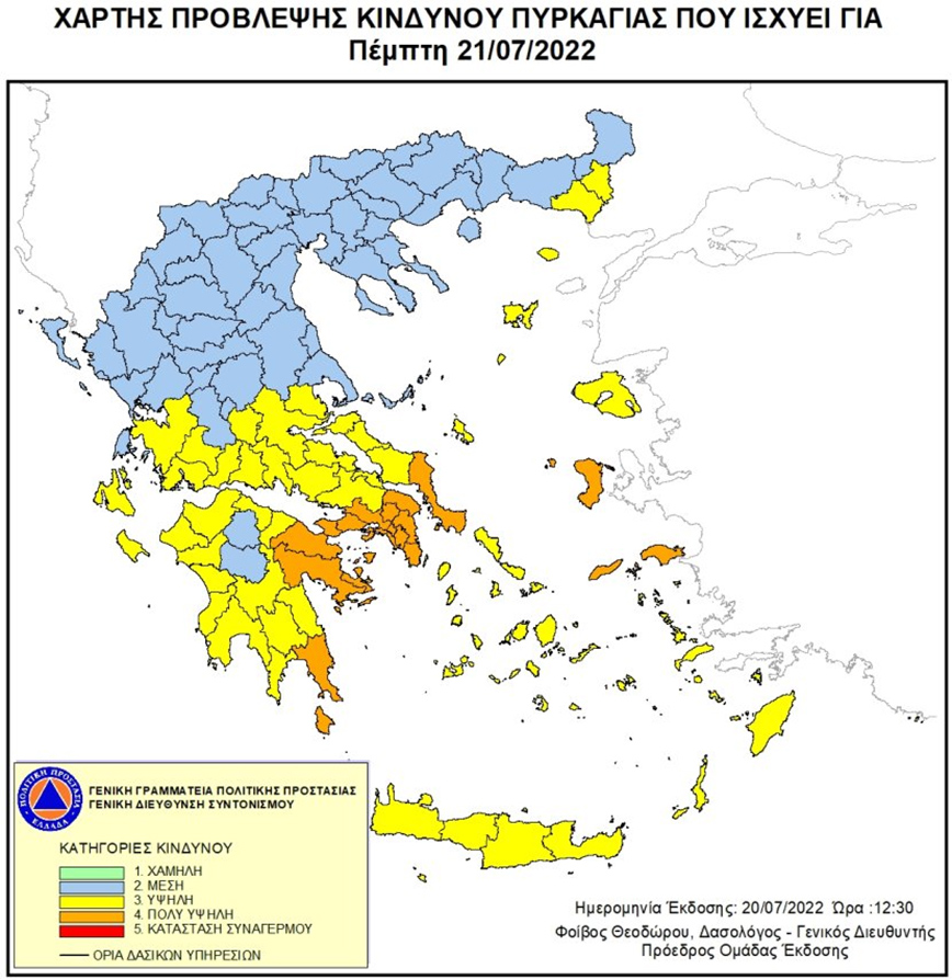 Σύμφωνα με το Χάρτη Πρόβλεψης Κινδύνου Πυρκαγιάς που εκδίδει η Γενική Γραμματεία Πολιτικής Προστασίας του Υπουργείου Κλιματικής Κρίσης & Πολιτικής Προστασίας (www.civilprotection.gr), για σήμερα Πέμπτη 21 Ιουλίου 2022, προβλέπεται πολύ υψηλός κίνδυνος πυρκαγιάς (κατηγορία κινδύνου 4) για τις εξής περιοχές: