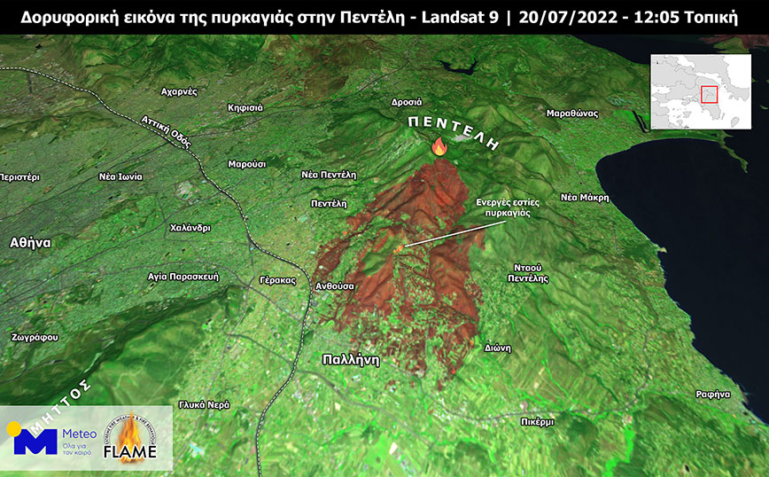 Συγκεκριμένα, με βάση εικόνα πολύ υψηλής ανάλυσης που ελήφθη από το δορυφόρο Landsat 9 την Τετάρτη 20.07.2022 στις 12:05 τοπική ώρα, την οποία ανέκτησε και επεξεργάστηκε η πυρομετεωρολογική ομάδα FLAME του Εθνικού Αστεροσκοπείου Αθηνών (ΕΑΑ) / meteo.gr, η νεότερη εκτίμηση για την έκταση που επηρέασε η δασική πυρκαγιά της Πεντέλης είναι περίπου 20.350 στρέμματα.
