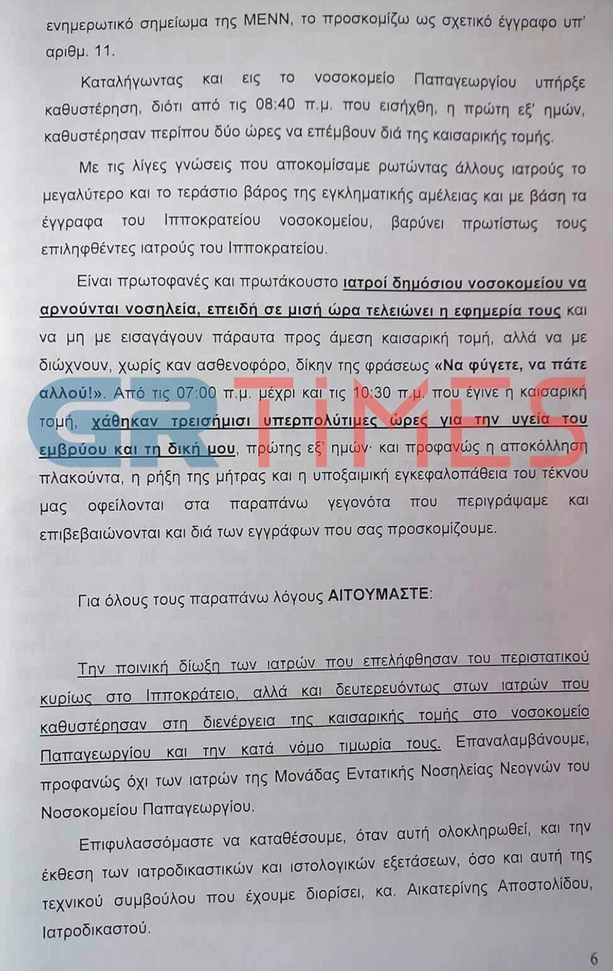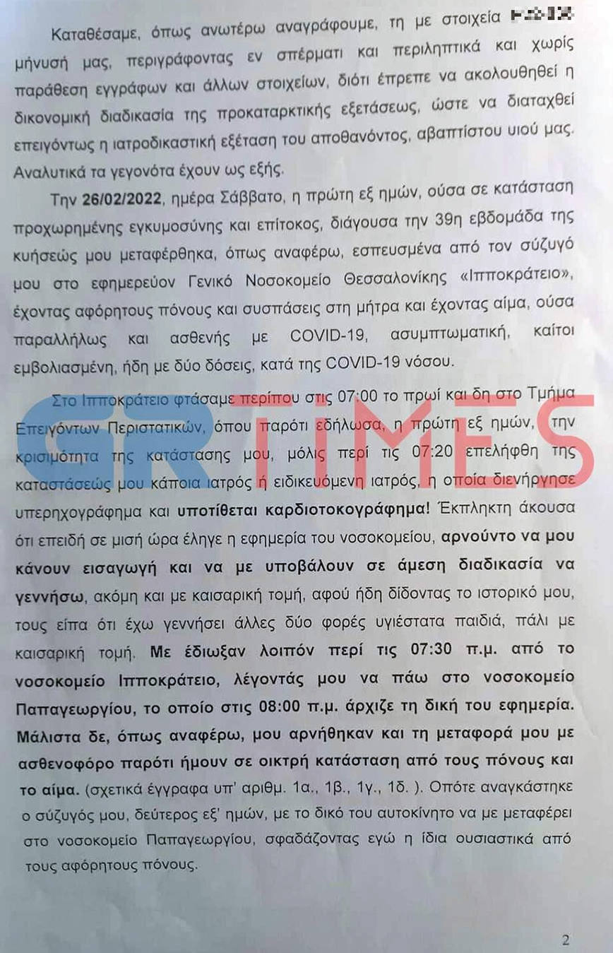 «Στο νοσοκομείο Παπαγεωργίου με εισήγαγαν αρχικώς περί τις 8.40 π.μ., αντί σε γυναικολογική κλινική για να γεννήσω, σε Covid -19 κλινική στο Τμήμα Επειγόντων Περιστατικών (ΤΕΠ) και μια ώρα μετά, ήτοι στις 9.40 π.μ., της ίδιας ημέρας, με εισήγαγαν στη μαιευτική κλινική για επείγουσα, άμεση χειρουργική επέμβαση καισαρικής τομής, όπου και τελικώς μια ώρα μετά, ήτοι στις 10.30 π.μ. γέννησα με καισαρική τομή ένα άσφυγμο, άρρεν, ώριμο νεογνό υπό ισχιακή προβολή, έχοντας ήδη υποστεί εκ της εγκληματικής αρνήσεως, αλλά και της καθυστερήσεως των δύο νοσοκομείων, αποκόλληση πλακούντα και ρήξη μήτρας» συμπληρώνει η μητέρα.