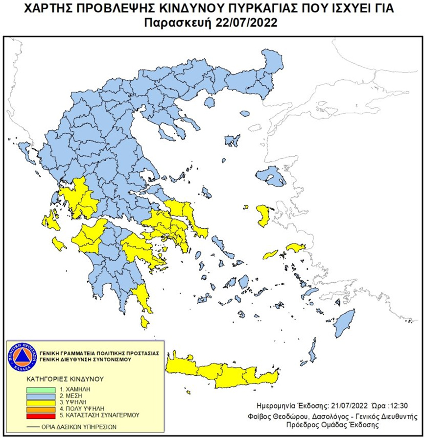 Σύμφωνα με το Χάρτη Πρόβλεψης Κινδύνου Πυρκαγιάς που εκδίδει η Γενική Γραμματεία Πολιτικής Προστασίας του Υπουργείου Κλιματικής Κρίσης & Πολιτικής Προστασίας προβλέπεται πολύ υψηλός κίνδυνος πυρκαγιάς (κατηγορία κινδύνου 4) για τις εξής περιοχές: