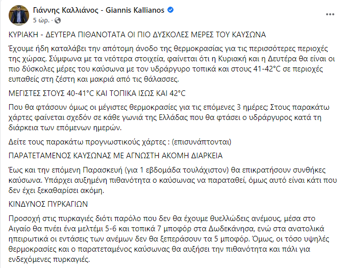 Στην ανάρτησή του στο Facebook ο Γιάννης Καλλιάνος ανέφερε ότι την Κυριακή και τη Δευτέρα, θα είναι πιθανότατα οι πιο δύσκολες ημέρες του καύσωνα.