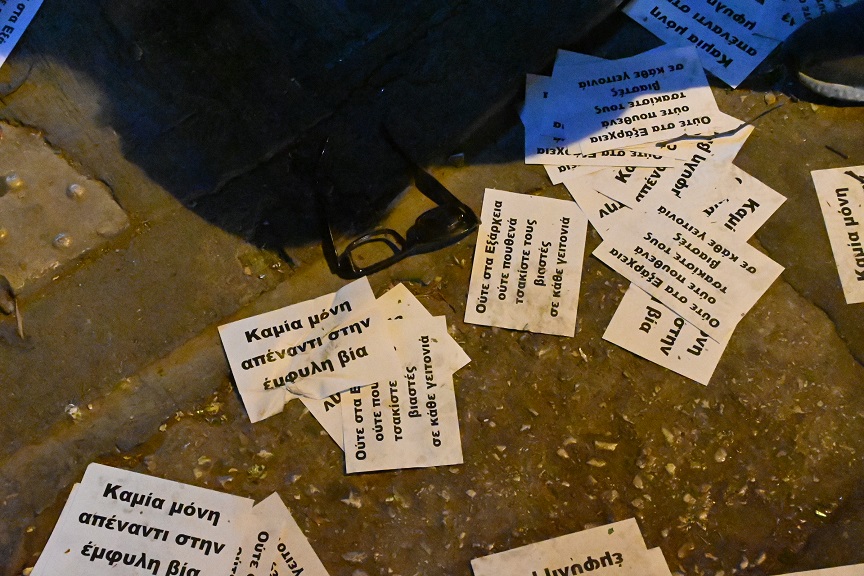 Πριν αρχίσουν τα επεισόδια πέταξαν φυλλάδια που έγραφαν «καμία μόνη απέναντι στην έμφυλη βία» και «ούτε στα Εξάρχεια, ούτε πουθενά τσακίστε τους βιαστές σε κάθε γειτονιά»