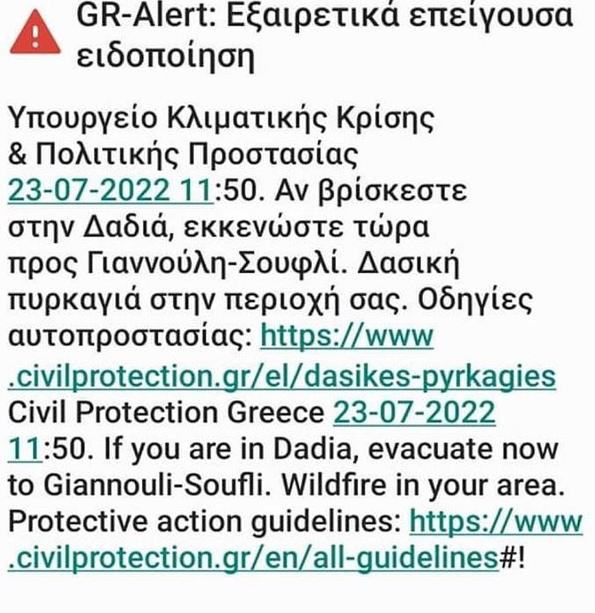 Οι κάτοικοι ενημερώθηκαν ότι πρέπει να φύγουν άμεσα τον οικισμό της Δαδιάς, προς Γιαννούλη και Σουφλί, ενώ εστάλη και μήνυμα από το 112 της Πολιτικής Προστασίας.