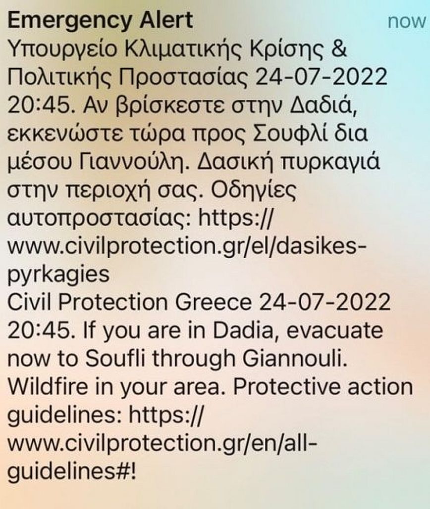 Τα εναέρια μέσα δίνουν μάχη με ρίψεις νερού για να περιορίσουν τη φωτιά, ενώ λίγο πριν τις 9 το βράδυ στάλθηκε μήνυμα από το 112 για εκκένωση της Δαδιάς προς Σουφλί.