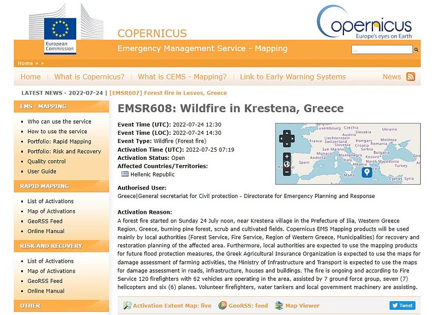 Ενεργοποιήθηκε η Υπηρεσία Copernicus/Emergency Management Service – Mapping της Ευρωπαϊκής Ένωσης για την άμεση χαρτογράφηση της περιοχής των Κρεστένων στην Ηλεία, όπου ξέσπασε χθες πυρκαγιά (24/7).