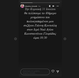 Η επιχειρηματίας και παρουσιάστρια του Cash or Trash του Star Channel, είναι πού θλιμμένη, από την απώλεια του συζύγου της. Μέσα από story της στο Instagram σήμερα το πρωϊ, Τρίτη (26/07) η Δέσποινα Μοιραράκη ανακοίνωσε ότι το 40ήμερο μνημόσυνο από τον θάνατο του συζύγου της θα γίνει την ερχόμενη Κυριακή (31/7).