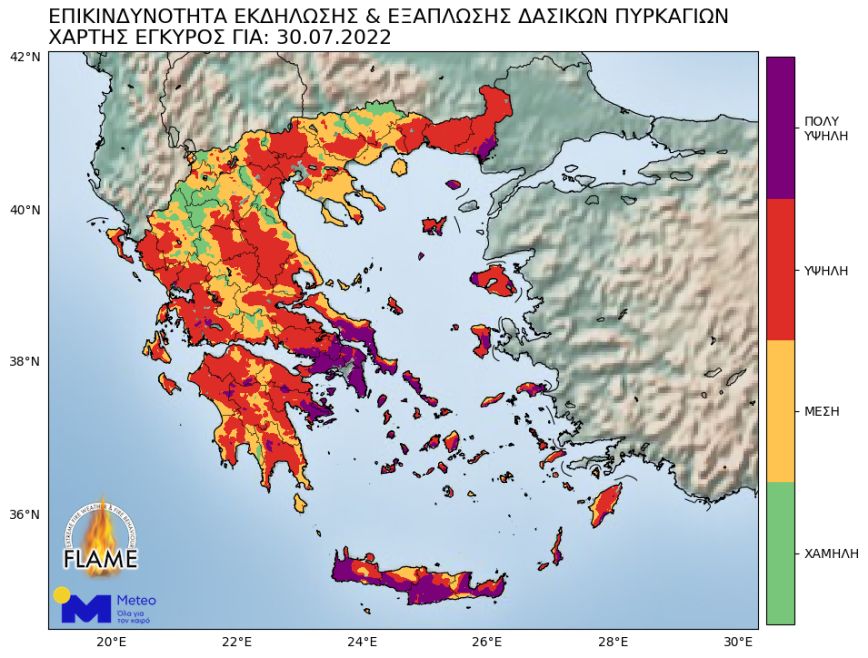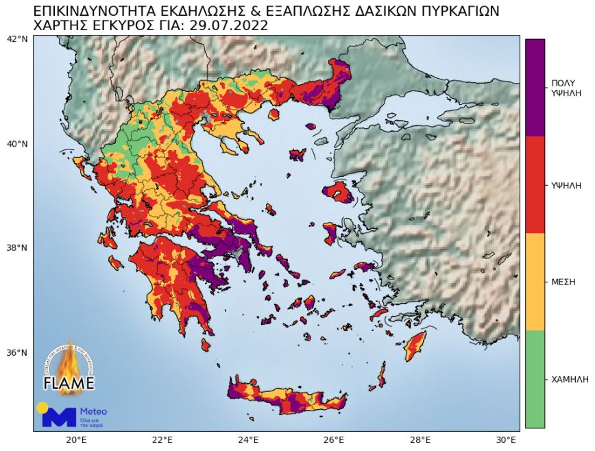 Ανησυχία προκαλεί ο ιδιαίτερα επικίνδυνος για την εκδήλωση και εξάπλωση δασικών πυρκαγιών τύπος καιρού Hot – Dry – Windy, ο συνδυασμός δηλαδή του ζεστού και ταυτόχρονα ξηρού καιρού και των υψηλών θερμοκρασιών και ισχυρών ανέμων. Ο κίνδυνος εκδήλωσης πυρκαγιών σήμερα είναι πολύ υψηλός (4), ειδικά για Αττική και Κύθηρα, Εύβοια, ανατολική Στερεά Ελλάδα, περιοχές σε Πελοπόννησο και σε Ζάκυνθο, νησιά Βορείου Αιγαίου και Κυκλάδες, Έβρο.