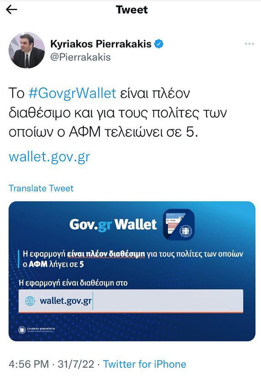 Η πλατφόρμα Gov.gr Wallet τέθηκε πλέον σε λειτουργία και για τους πολίτες των οποίων το ΑΦΜ τελειώνει σε 5, οι οποίοι επιθυμούν να ενεργοποιήσουν το ψηφιακό δελτίο ταυτότητας και το ψηφιακό δίπλωμα οδήγησης.