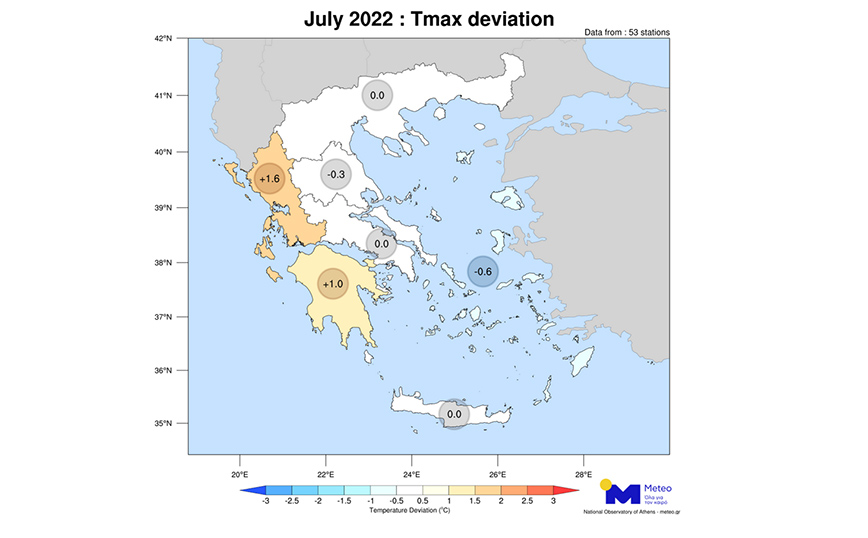 Στην Κέρκυρα και στον Πύργο Ηλείας καταγράφηκαν οι περισσότερες ημέρες με θετικές αποκλίσεις της θερμοκρασίας, με 24 από τις 31 ημέρες του μήνα να είναι θερμότερες από τον μέσο όρο της περιόδου 2010-2019. Αντίθετα, στην Πάρο καταγράφηκαν 24 ημέρες με αρνητικές αποκλίσεις θερμοκρασίας, ενώ στην Τήνο 22 ημέρες υπό την επίδραση του ισχυρού μελτεμιού.