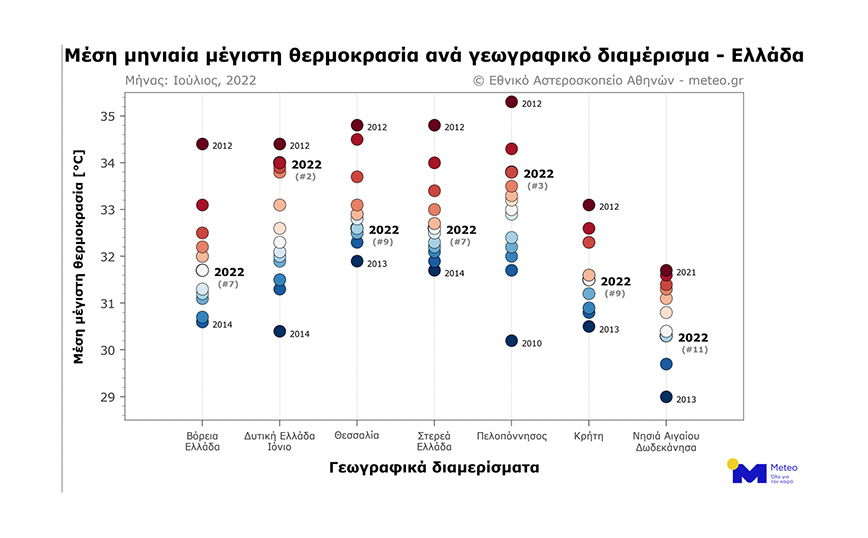 Κοντά στα φυσιολογικά για την εποχή επίπεδα κυμάνθηκε η θερμοκρασία τον Ιούλιο του 2022 στο μεγαλύτερο μέρος της ηπειρωτικής και νησιωτικής χώρας, με εξαίρεση τη Δυτική Ελλάδα και την Πελοπόννησο. Πρόκειται για τον δεύτερο πιο θερμό Ιούλιο για τη Δυτική Ελλάδα από την αρχή των συστηματικών καταγραφών το 2010 και τον τρίτο πιο θερμό μήνα για την Πελοπόννησο.