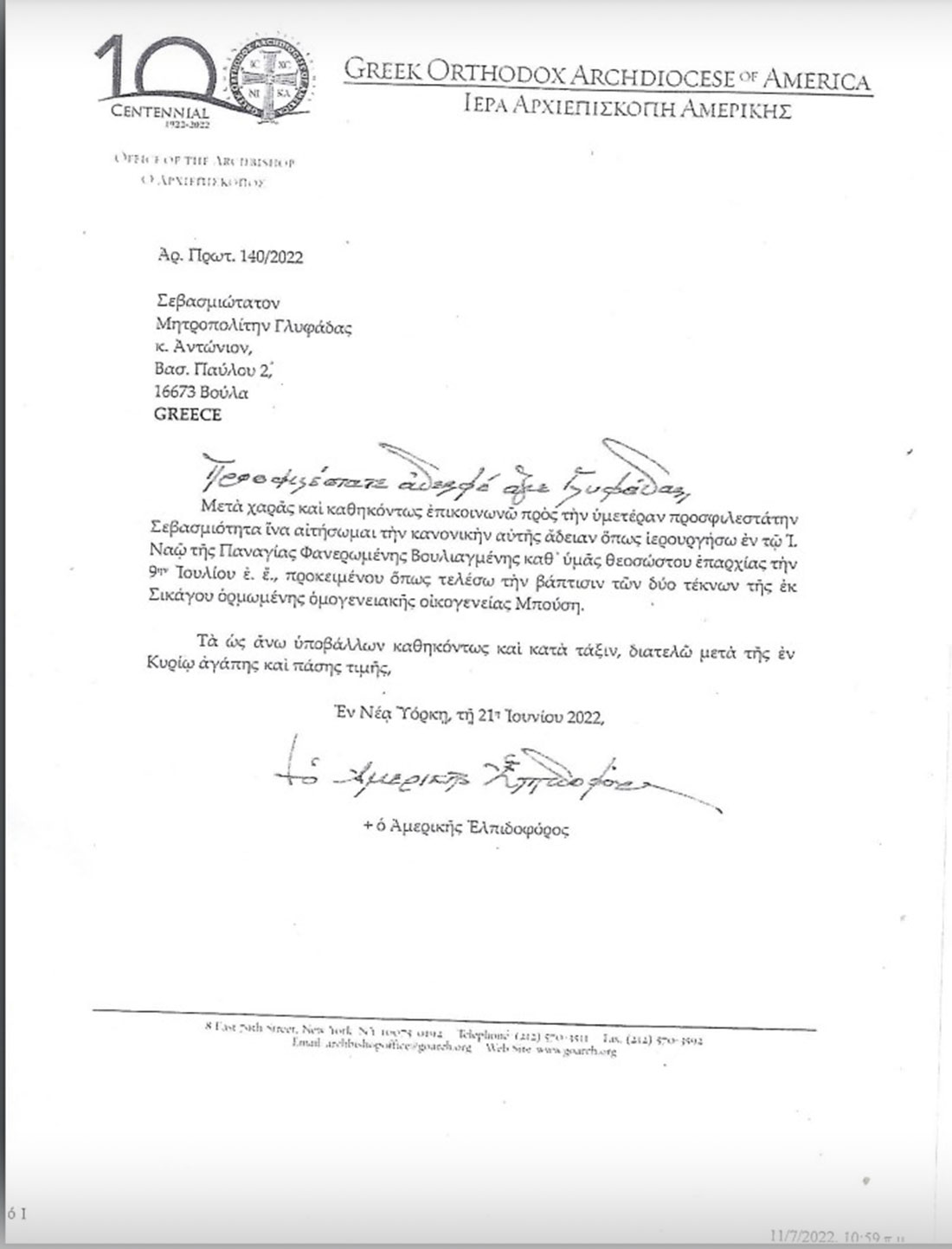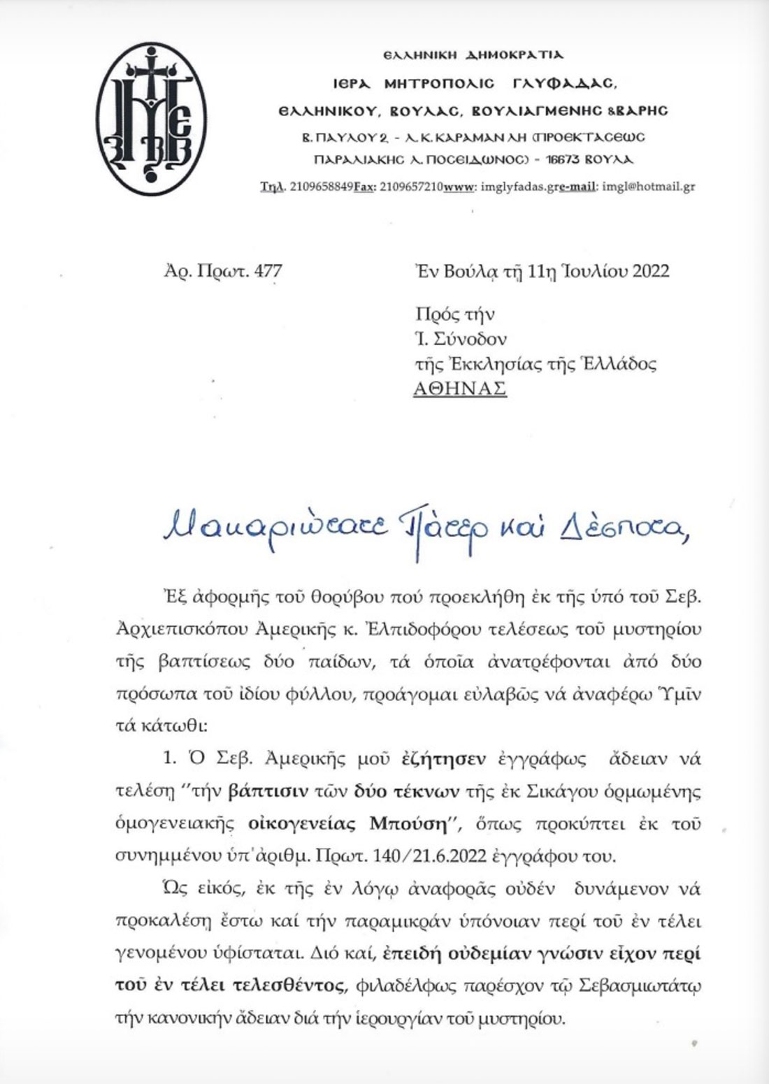 «Μετά χαράς και καθηκόντως επικοινωνών προς την υμετέραν προσφιλεστάτην Σεβασμιότητα όνα αιτήσωμαι την κανονικής αυτής άδειαν όπως ιερουργήσω εν τω Ι. Ναό της Παναγίας Φανερωμένης Βουλιαγμένης καθ΄υμάς θεοσώστου επαρχίας την 9ην Ιουλίου ε.ε., προκειμένου όπως τελέσω την βάπτισιν των δύο τέκνων της εκ Σικάγου ορμωμένης ομογενειακής οικογένειας Μπούση.