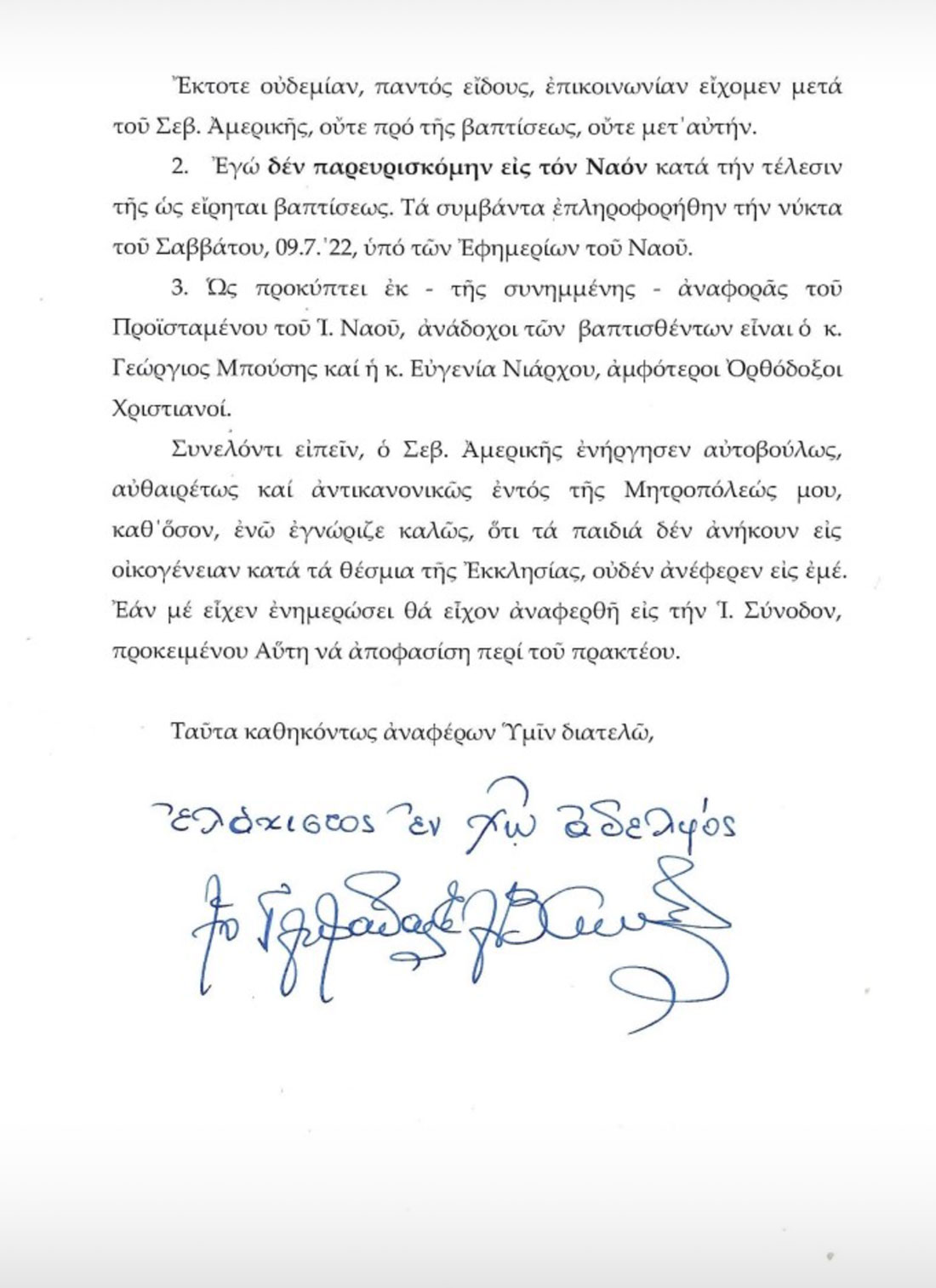 Τα ως άνω υποβάλλων καθηκόντως και κατά τάξιν, διατελώ μετά της εν Κυρίω αγάπης και πάσης τιμής».