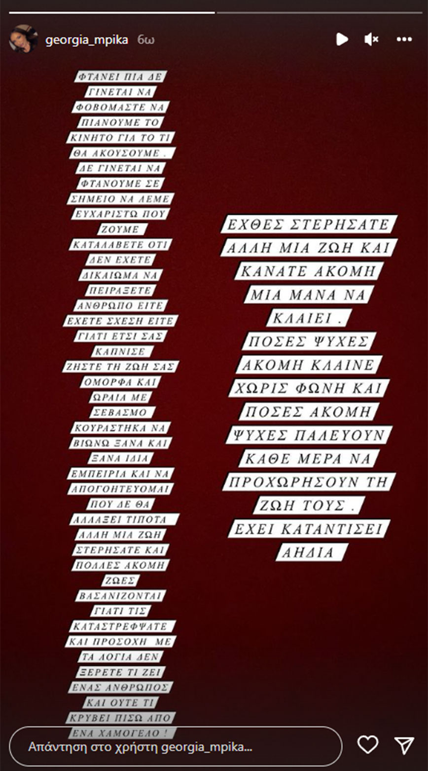 Αναλυτικά η Γεωργία Μπίκα αναφέρει: «Φτάνει πια! Δεν γίνεται να φοβόμαστε να πιάνουμε το κινητό για το τι θα ακούσουμε. Δεν γίνεται να φτάνουμε σε σημείο να λέμε ευχαριστώ που ζούμε. Καταλάβετε ότι δεν έχετε δικαίωμα να πειράξετε άνθρωπο είτε έχετε σχέση είτε γιατί έτσι σας κάπνισε. Ζήστε τη ζωή σας όμορφα και ωραία, με σεβασμό!