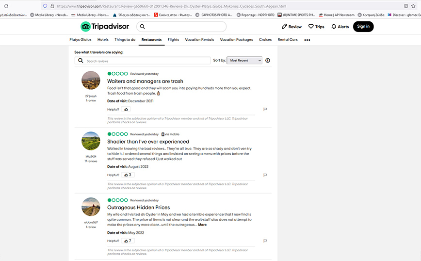 Με τη βαθμολογία του DK Oyster στο Tripadvisor να είναι μόλις 2,5 αστέρια, μετά από τις 1.455 αξιολογήσεις πελατών που έχουν βρεθεί στο εστιατόριο, η σελίδα κατακλύζεται από λογαριασμούς με ένα αστέρι από ανθρώπους που κατηγορούν το εστιατόριο για απαίσια εξυπηρέτηση, επιθετικές τακτικές και ύπουλα εξωφρενικές τιμές.