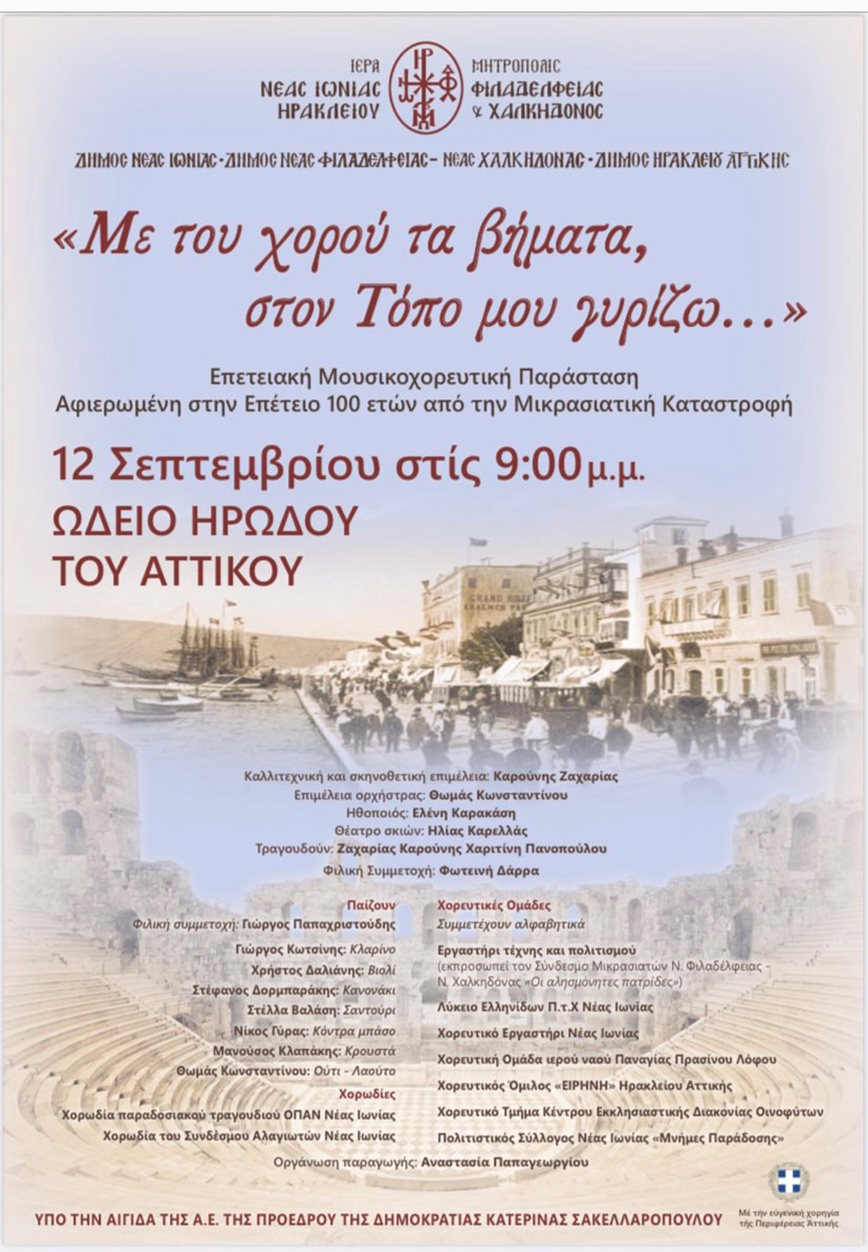 Με αφορμή την συμπλήρωση 100 ετών από την θλιβερή επέτειο της Μικρασιατικής Καταστροφής, η Ιερά Μητρόπολη Νέας Ιωνίας, Φιλαδελφείας, Ηρακλείου και Χαλκηδόνος τιμά τις ρίζες της στο Ωδείο Ηρώδου του Αττικού με μία επετειακή μουσικοχορευτική εκδήλωση με τίτλο: