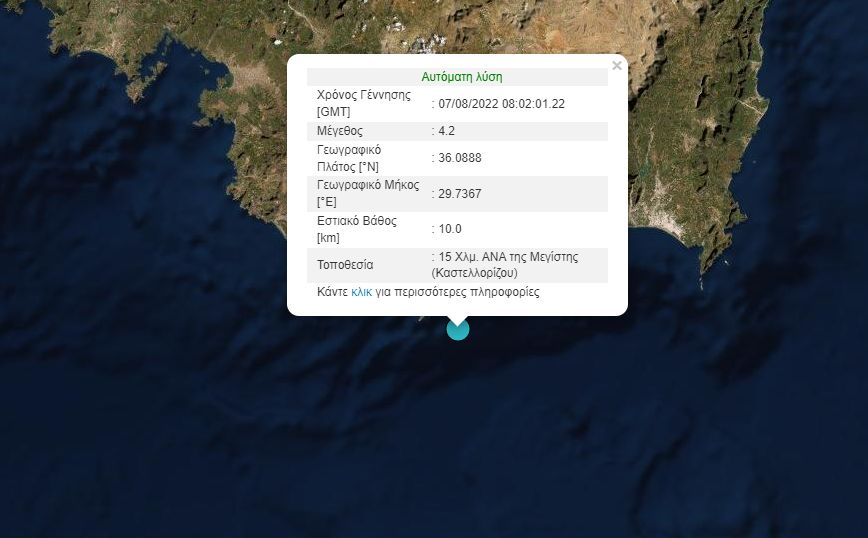 Το επίκεντρο της δόνησης εντοπίζεται 15 χλμ. ανατολικο-νοτιοανατολικά της Μεγίστης, ενώ το εστιακό της βάθος υπολογίζεται στα 10 χλμ.