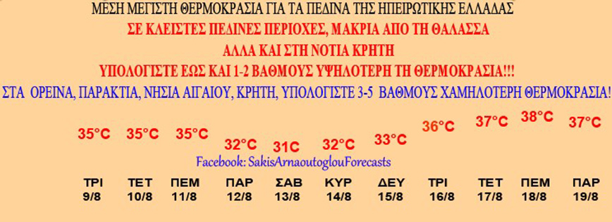 «Ενδείξεις για άστατο καιρό τα μεσημέρια – απογεύματα στην ενδοχώρα και κυρίως στα βόρεια ακόμα και τις βραδινές ώρες καθώς και υποχώρηση του υδραργύρου κατά 2-3 βαθμούς από τις 10 Αυγούστου μέχρι και τον 15Αυγουστο!» τονίζει ο Σάκης Αρναούτογλου και ποστάρει στον παρακάτω πίνακα με τις θερμοκρασίες.