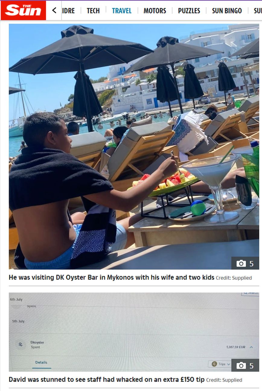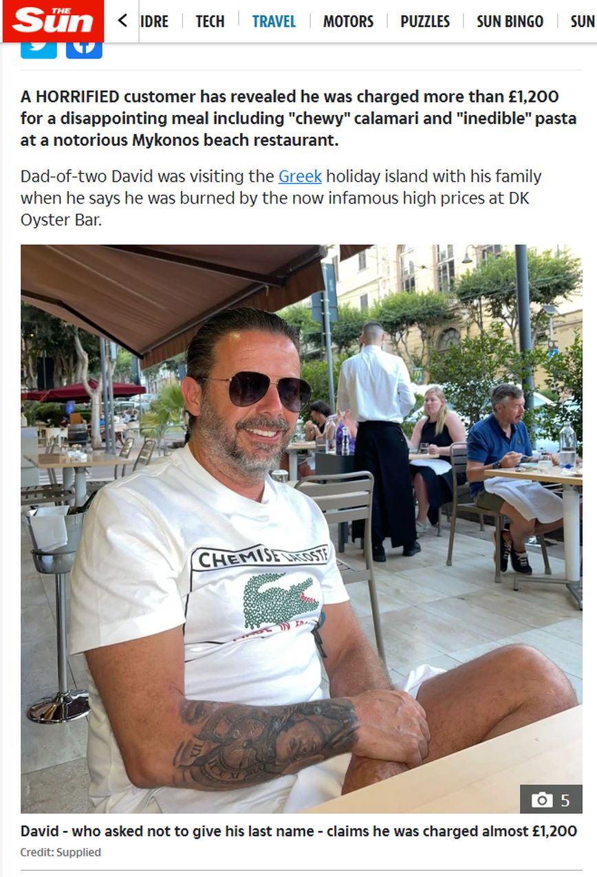 Σύμφωνα με τα όσα ανέφερε ο Ντέιβιντ, ο οποίος δεν θέλησε να δώσει στη δημοσιότητα το επίθετο του, στην Sun ταξίδεψε από την Αυστραλία στη Μύκονο και συγκεκριμένα στον Πλατύ Γιαλό, και μόλονότι περίμενε υψηλές τιμές, έμεινε σοκαρισμένος όταν έφτασε η στιγμή να πληρώσει τον λογαριασμό για το γεύμα που είχε καταναλώσει εκείνος, η σύζυγος του και τα δυο τους παιδιά.