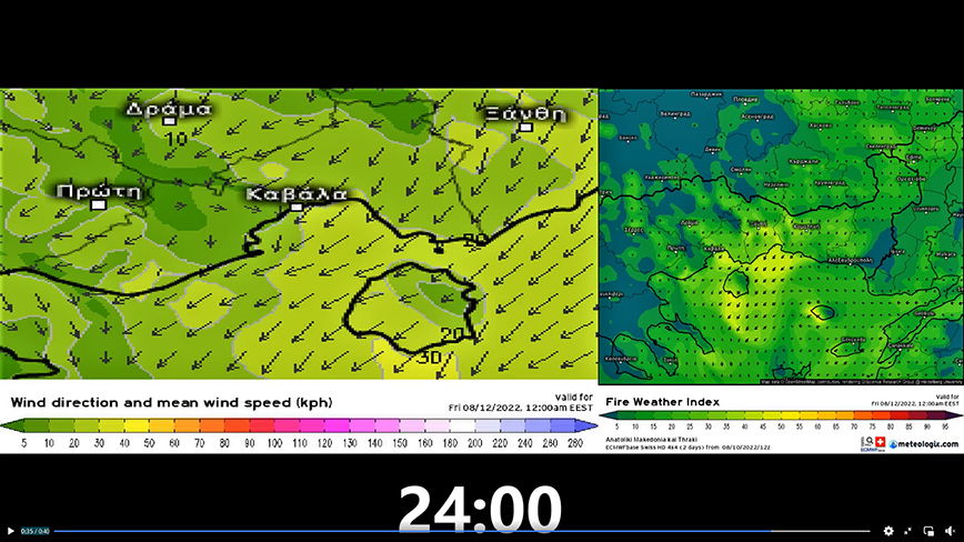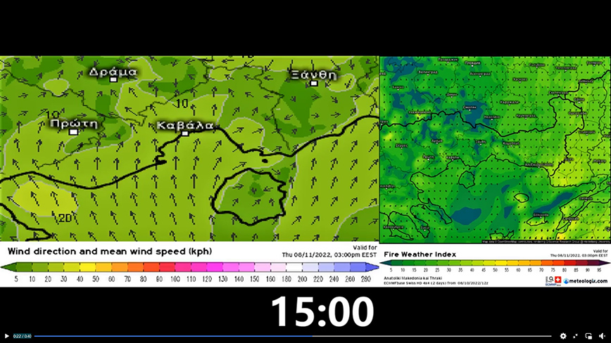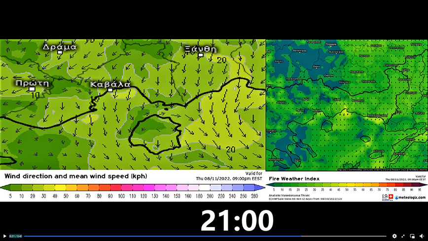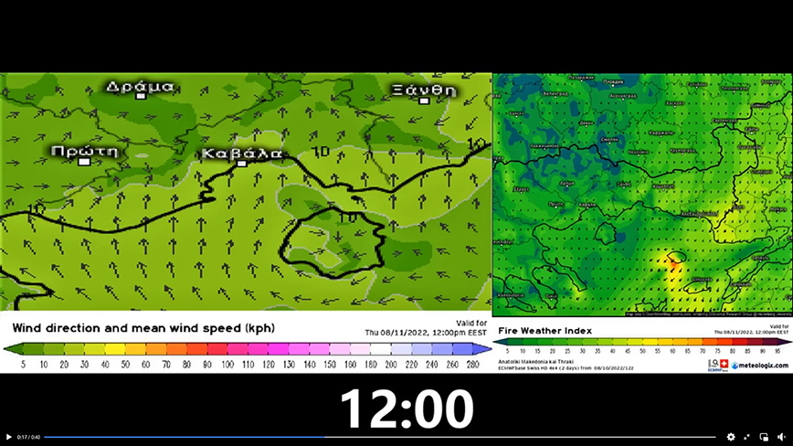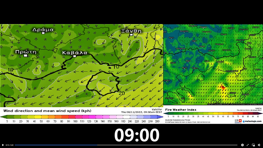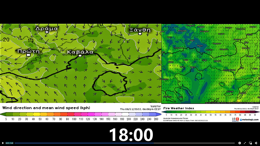 Στην αριστερή εικόνα των χαρτών που έδωσε στη δημοσιότητα το Meteokav.gr εμφανίζεται η μέση ένταση (km/h) και η διεύθυνση του ανέμου, ενώ στη δεξιά ο δείκτης FIRE WEATHER INDEX και δείχνουν τις συνθήκες που θα επικρατήσουν προοδευτικά μέσα στη ημέρα.
